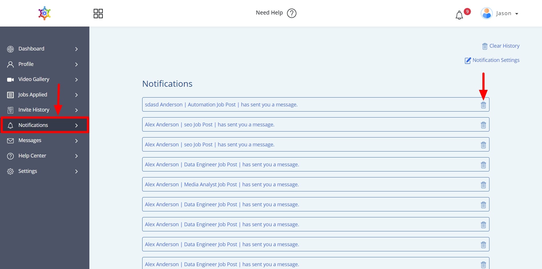 Click on “Notifications” in the left navigation panel to view all the notifications you have received. To delete a notification simply click on the trashcan icon.