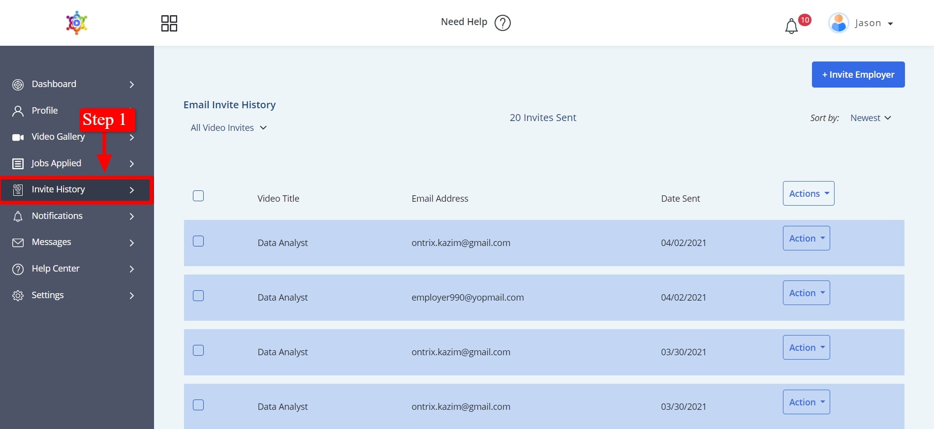 Click on “Invite History” in the left navigation panel to view all the employers you have invited.