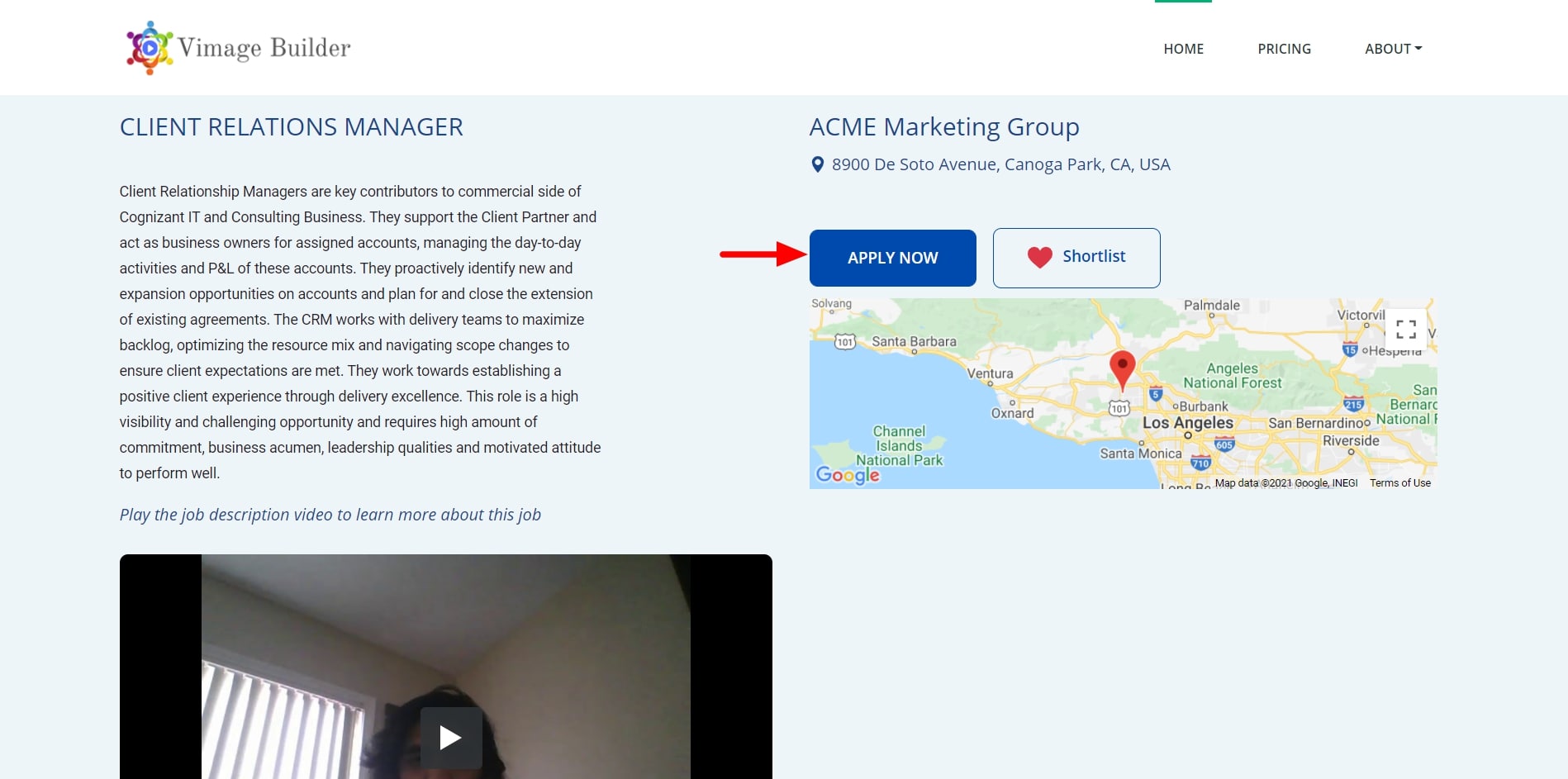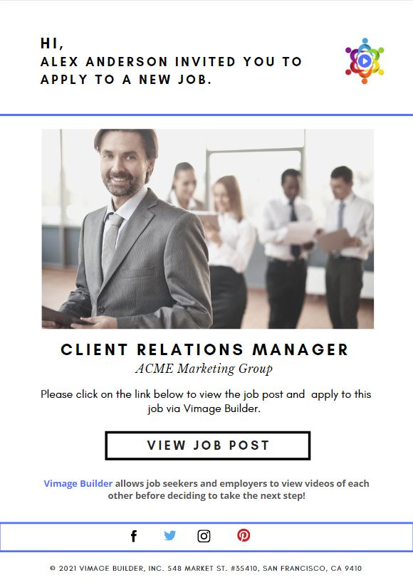 An employer sends you an email invitation to apply for a job via Vimage Builder. The email will look similar to this: