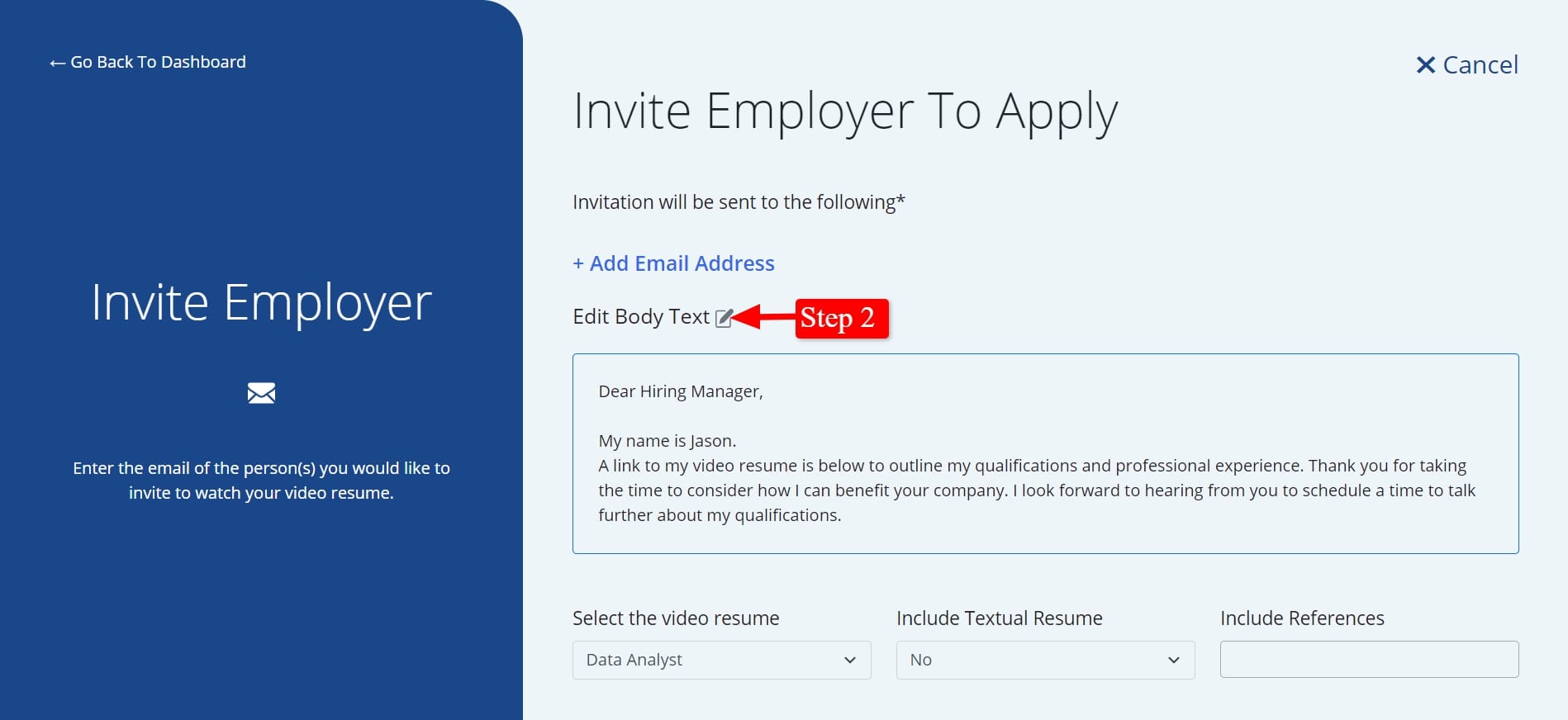 Step 1: Click on “Invite Employer”button In the center of the dashboard.